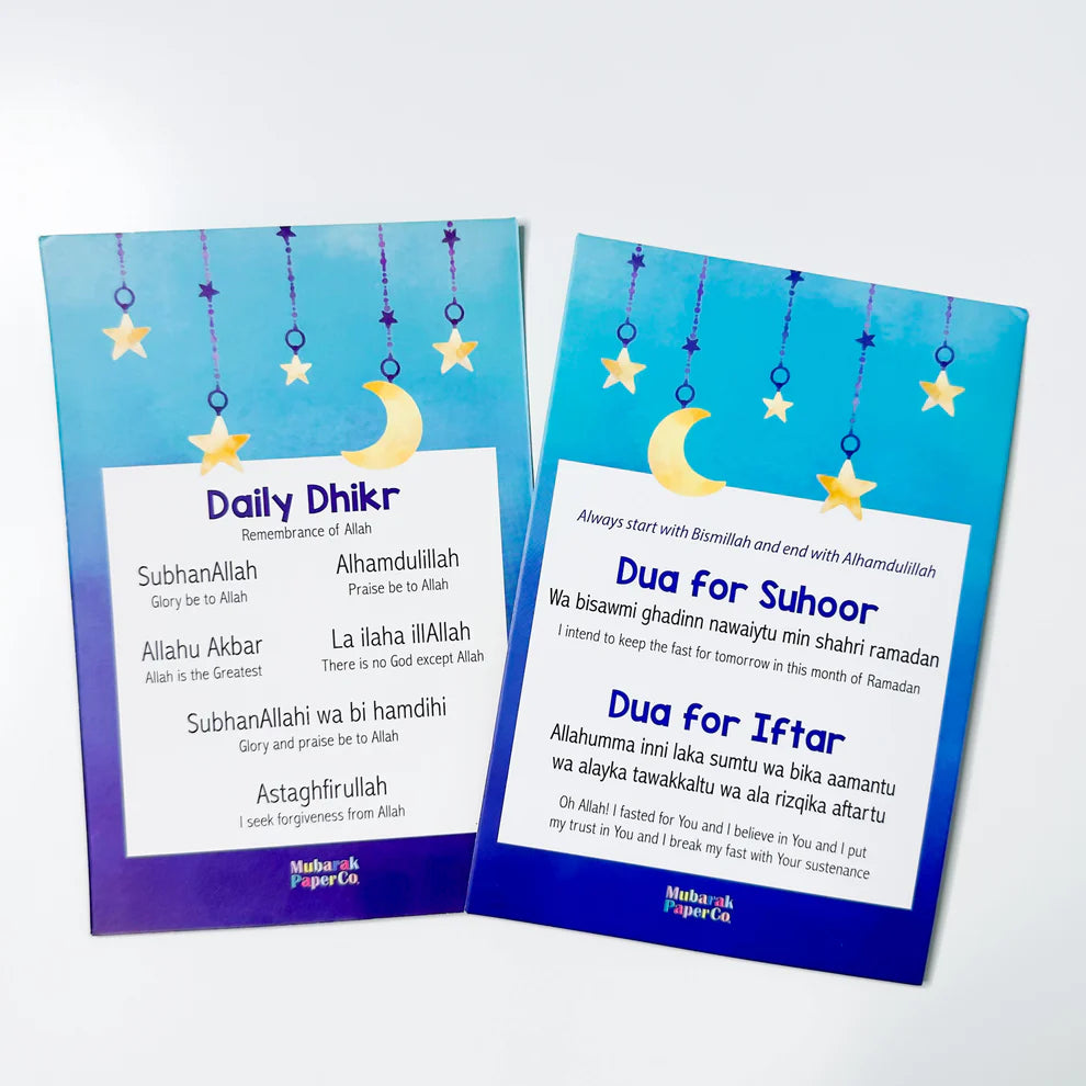 A great addition to kids Ramadan favor bags. Card includes Suhoor and Iftar duas, and daily dhikr.