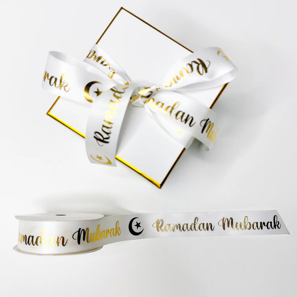Enhance your gift with our elegant Ramadan-themed satin ribbon featuring the phrase "Ramadan Mubarak" in either white or gold foil script, accompanied by a crescent and star icon. Choose from our selection of four colors.