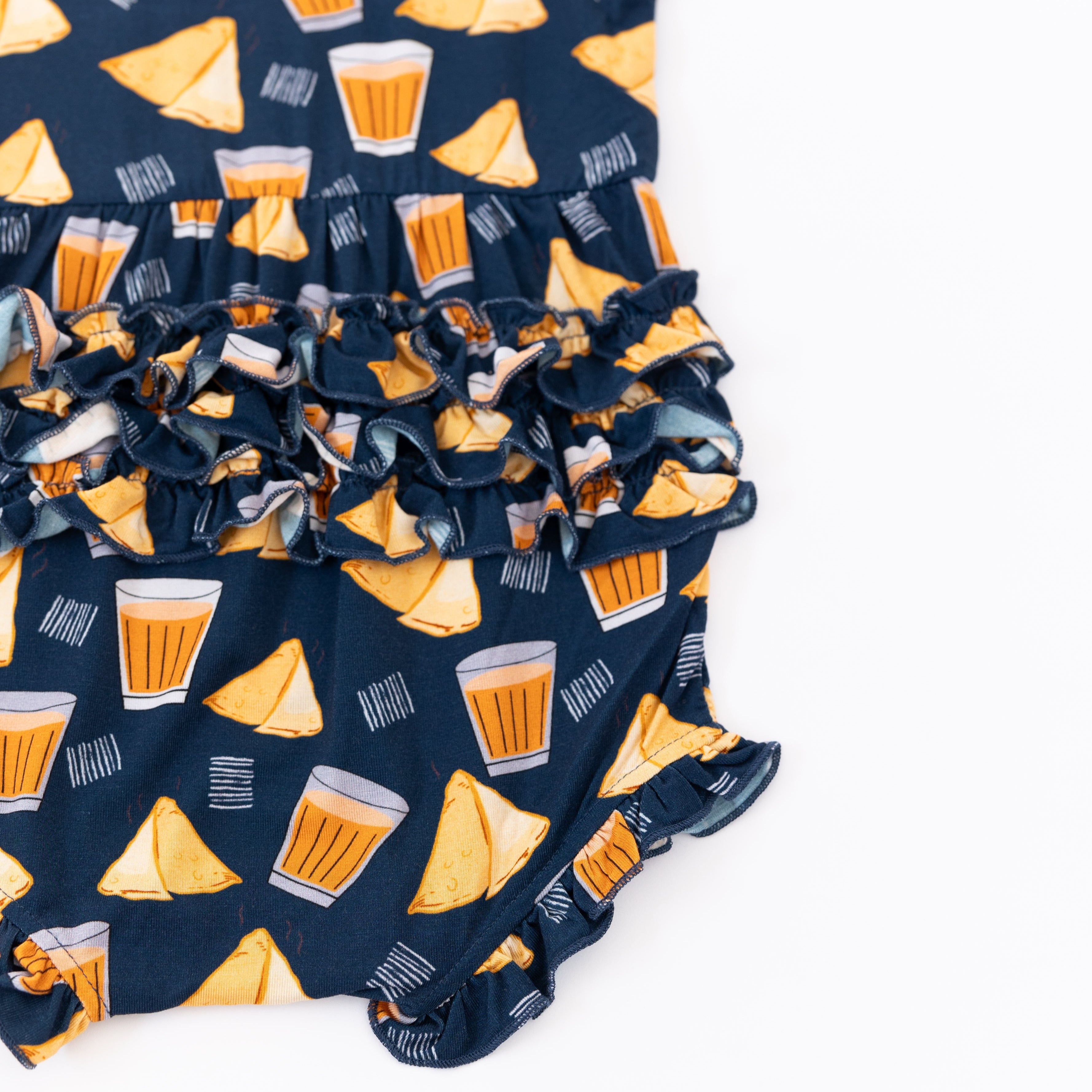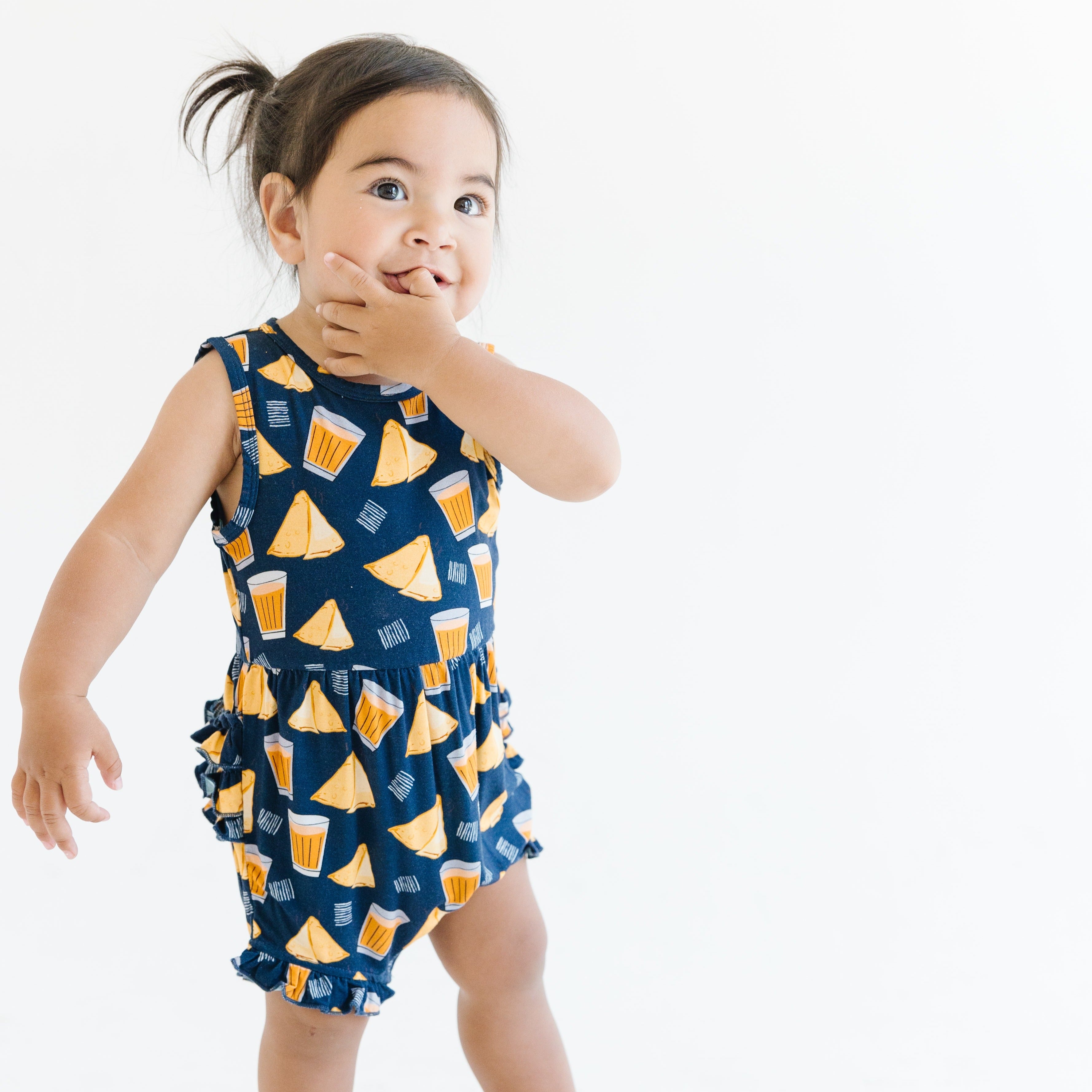 Whether it's for everyday wear, playtime adventures, or special occasions, this romper is just right. With a sleeveless design, your little one can explore the world comfortably and stylishly featuring a playful Samosa prints.