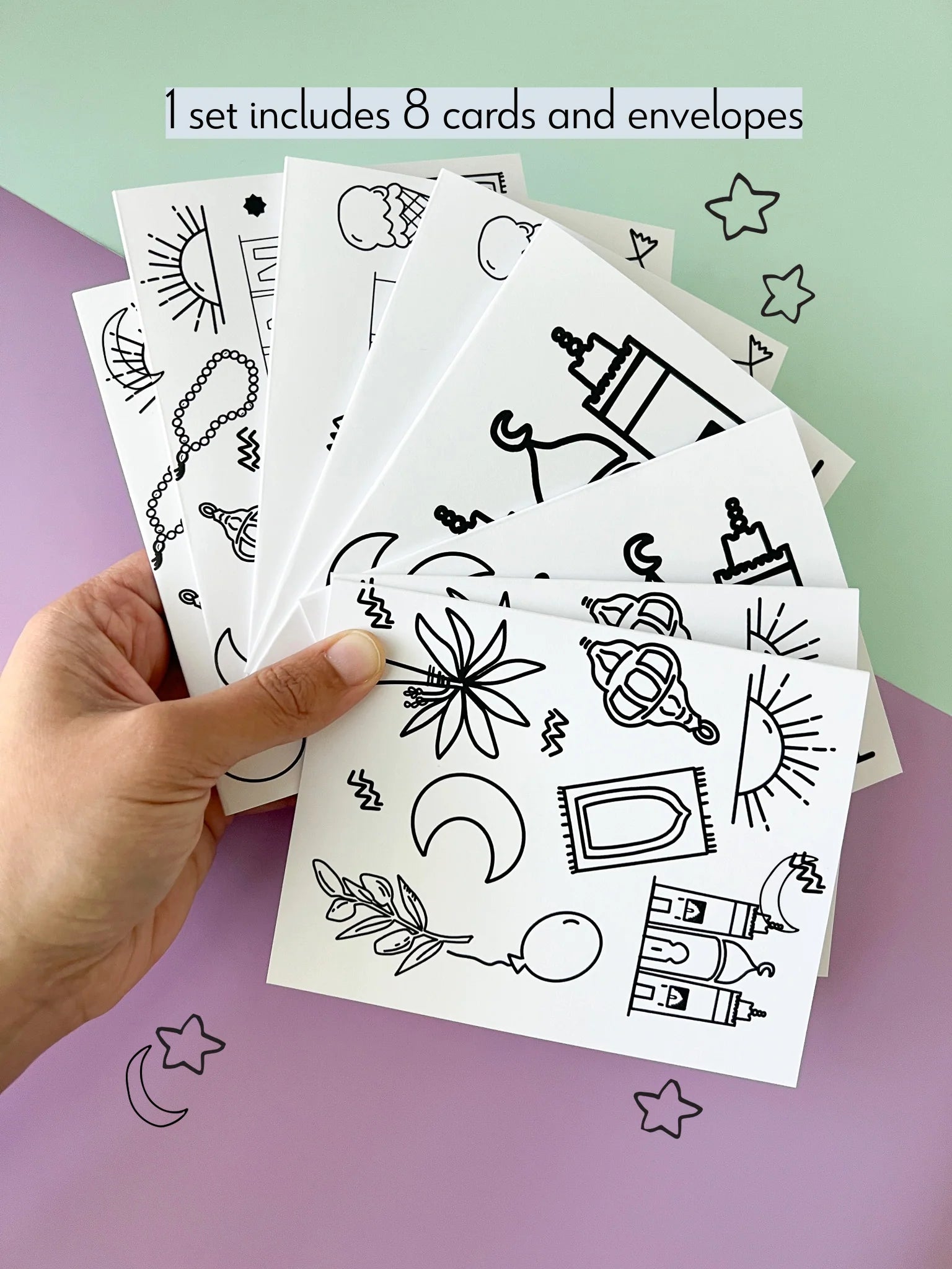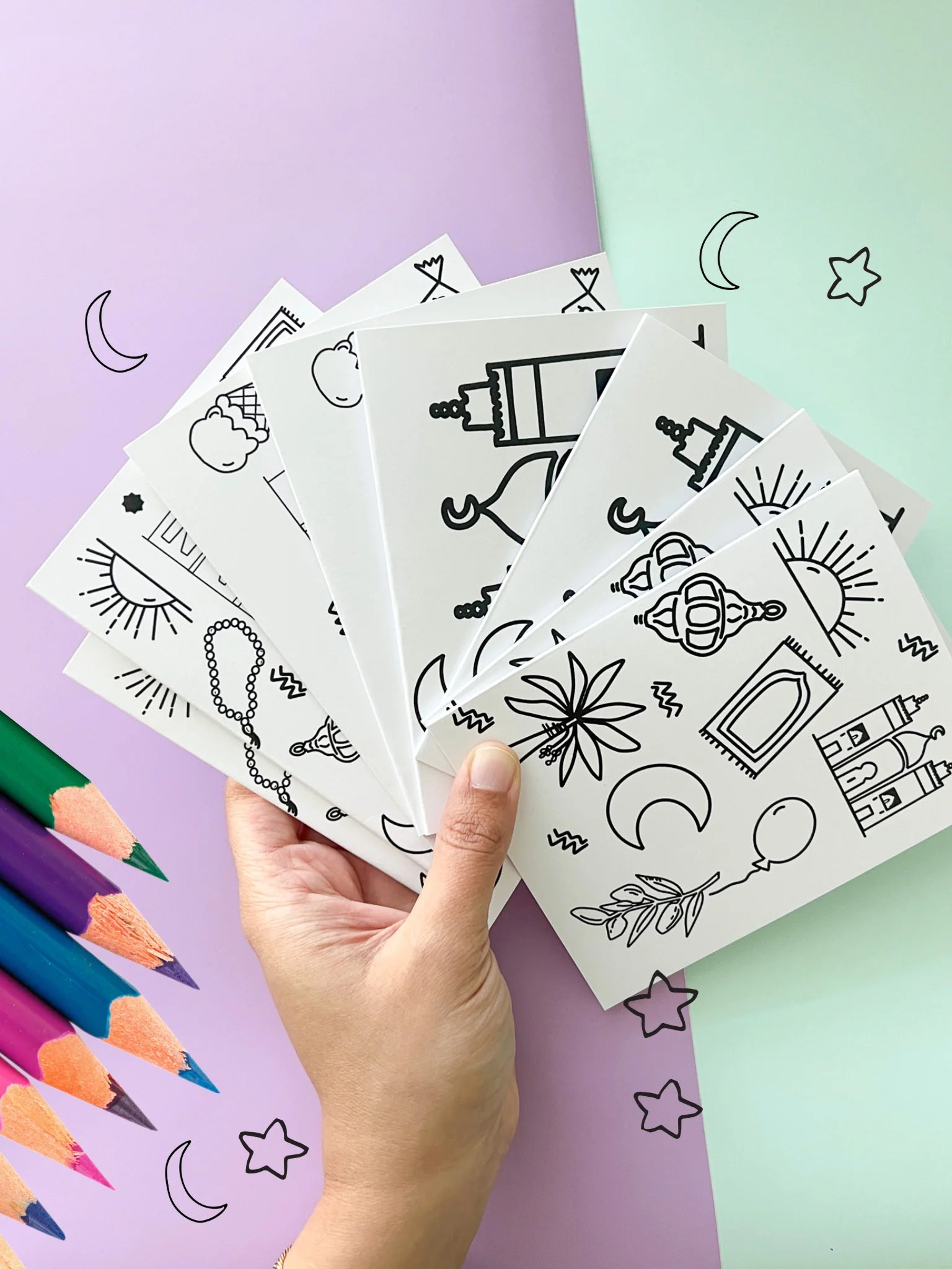 Set Includes: 8 cards featuring intricate Ramadan and Eid-inspired patterns for kids to color.