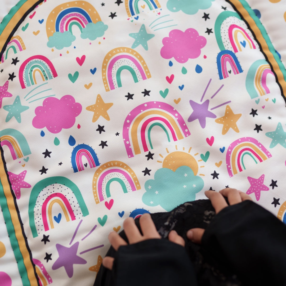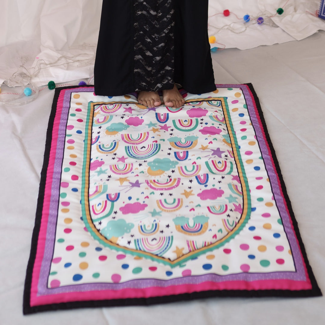 A bright and colorful prayer mat that’ll take your kid on a journey on her favorite rainbow print.