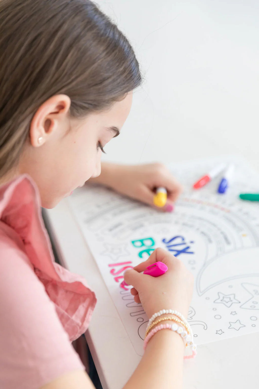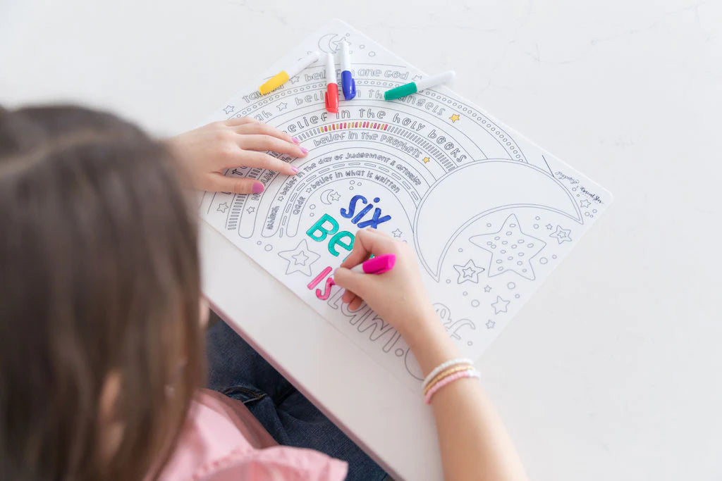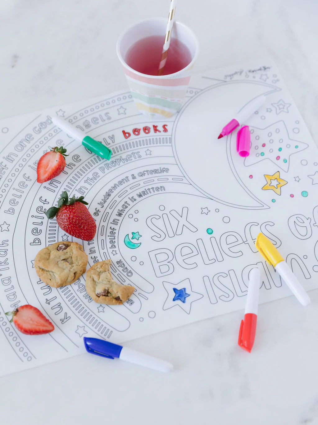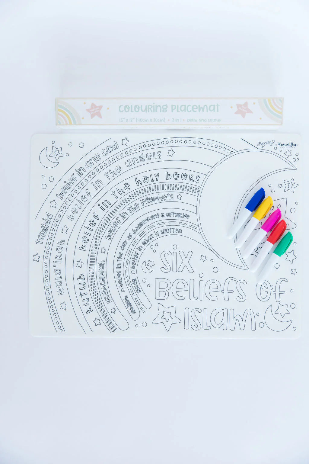 Six Beliefs Colouring Placemat is 2 in 1. Endless colouring on the font and draw your hearts desires on the back! While having fun colouring, learn and remember the six beliefs of Islam. Easy to clean and reuse!