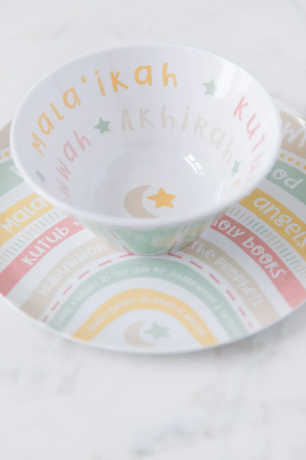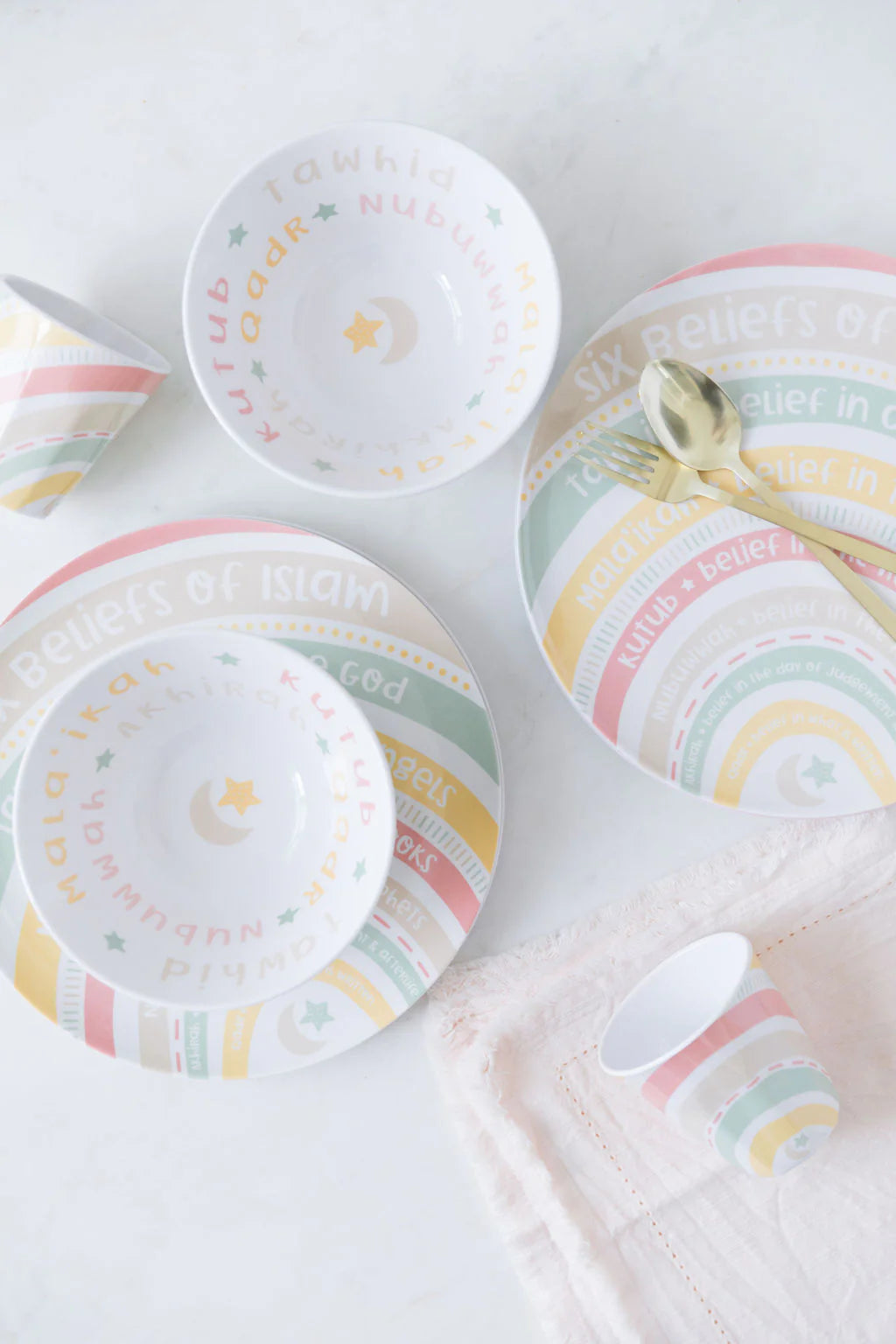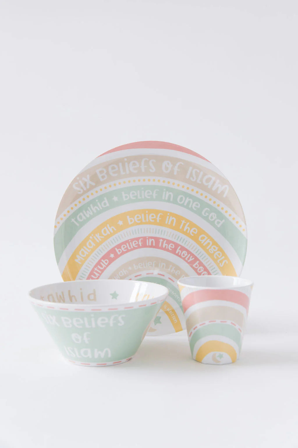 Everyone loves the beauty of a rainbow! The vibrant and neutral color tabletop set is a great way to teach kids about different colors, but more importantly a beautiful way to teach/ remind them of the six beliefs of Islam, while they eat!