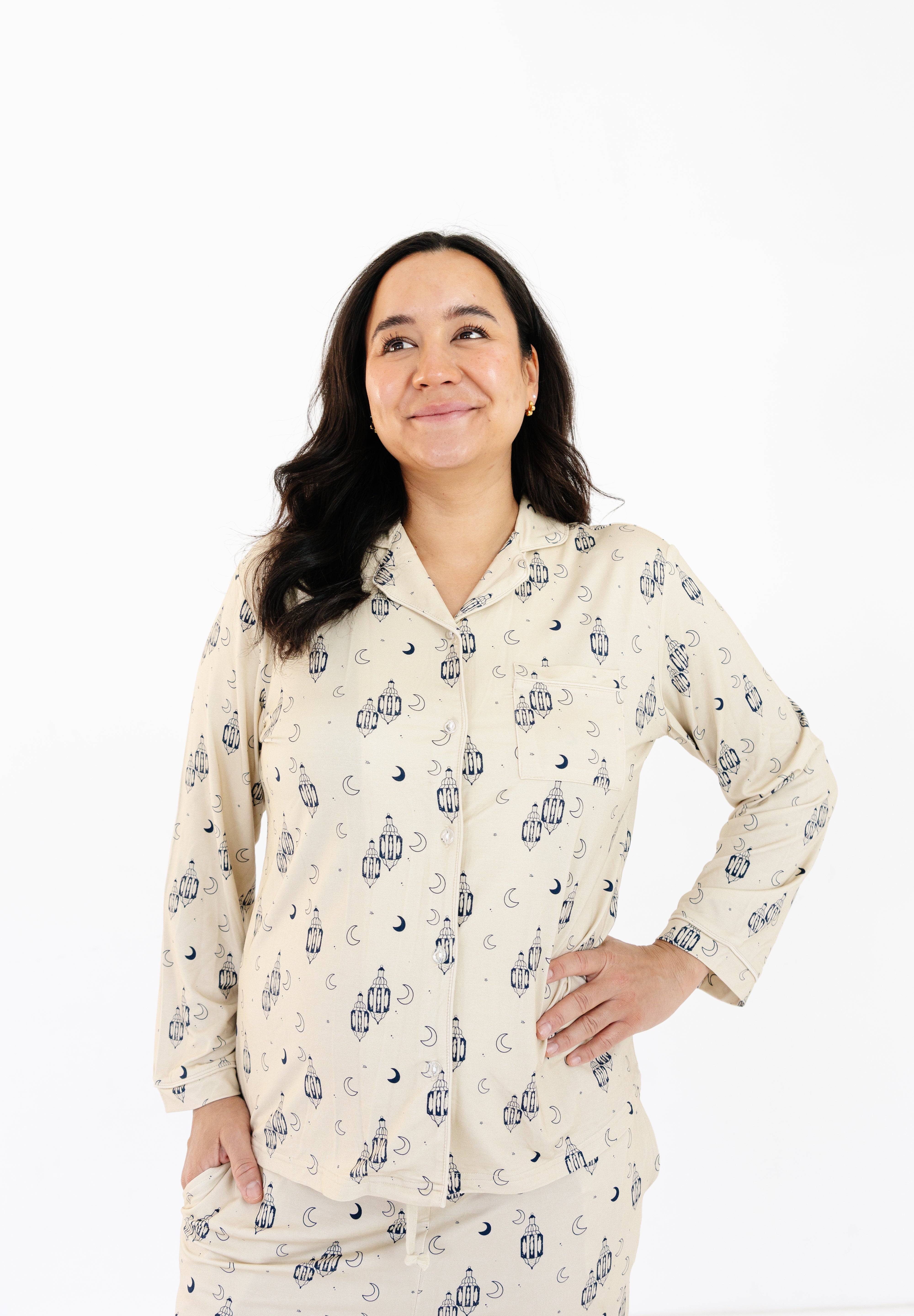 Soft neutrals meet subtle festive detail in the Women’s Two-Piece Pajama Set – Lantern Beige. Designed for calm Ramadan evenings and cozy Eid mornings, this matching set combines elegance with comfort, making downtime at home feel special.